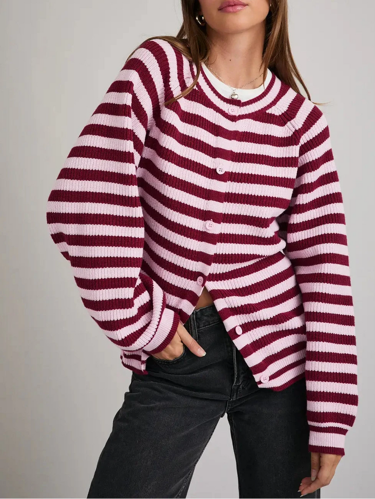 Raglan Long Sleeve Crew Neck Striped Cardigan