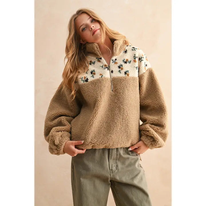 1/2 Zip Floral Contrast Printed Sherpa Jacket - Tan/Green / S is backordered and will ship as soon as it is back in stock.