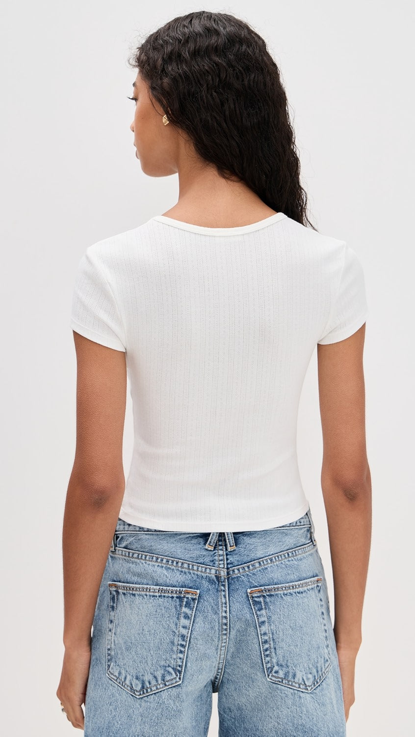 - Fabric: Lightweight pointelle jersey with stretch