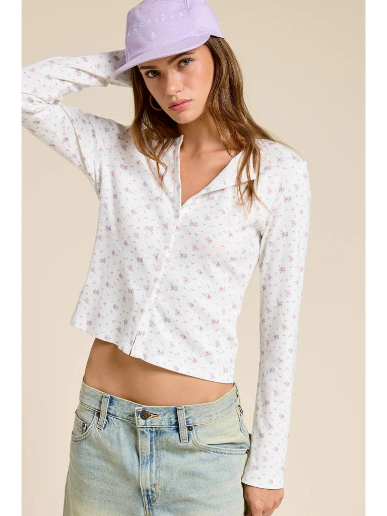 Long-Sleeve Floral Print Pointelle Knit Cardigan