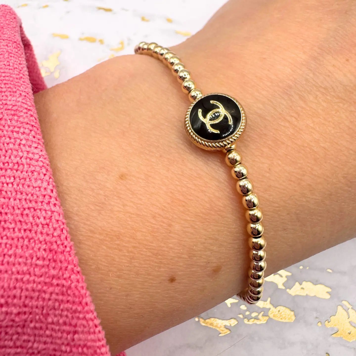 Our buttons are repurposed from preloved and vintage items Handcrafted with professional strength elastic jewelry cord to easy roll on and off Available Sizing : 5.5" to 7.5" Roll on and off your wrist gently to preserve longevity 14kg gold filled 3mm gold filled beads Sweat proof, waterproof and tarnish free! We give a second chance to vintage finds from designer brands by redesigning pre owned authentic pieces into unique jewellery to add to your collection. Limited pieces available and restocks are also uncertain