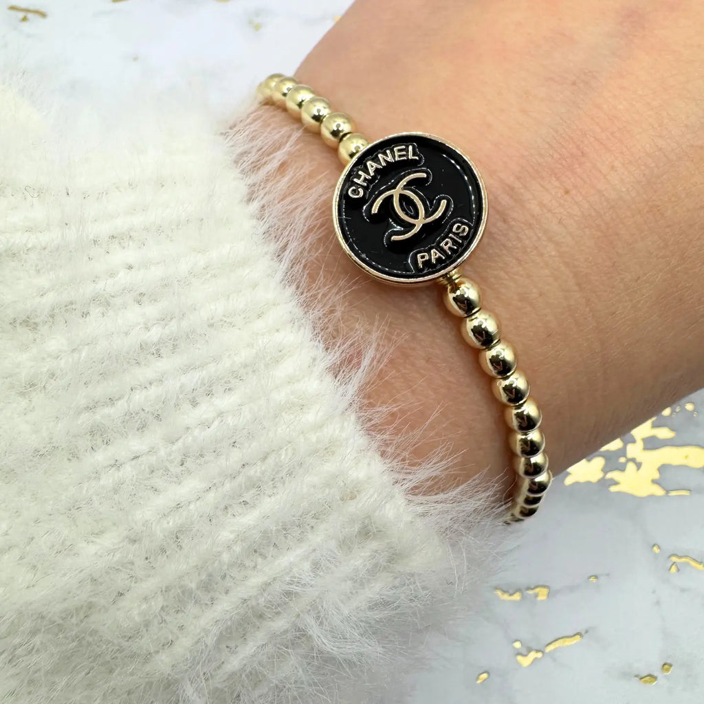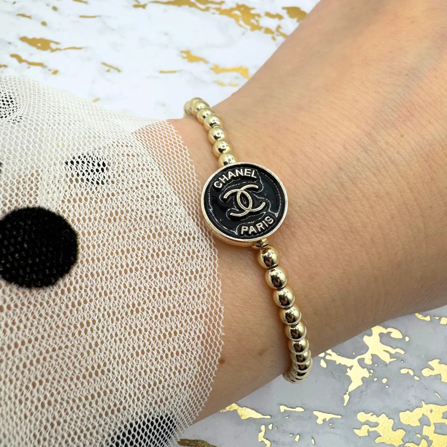 Our buttons are repurposed from preloved and vintage items Handcrafted with professional strength elastic jewelry cord to easy roll on and off Available Sizing : 5.5" to 7.5" Roll on and off your wrist gently to preserve longevity 14kg gold filled 4mm gold filled beads Sweat proof, waterproof and tarnish free! We give a second chance to vintage finds from designer brands by redesigning pre owned authentic pieces into unique jewellery to add to your collection. Limited pieces available and restocks are also uncertain