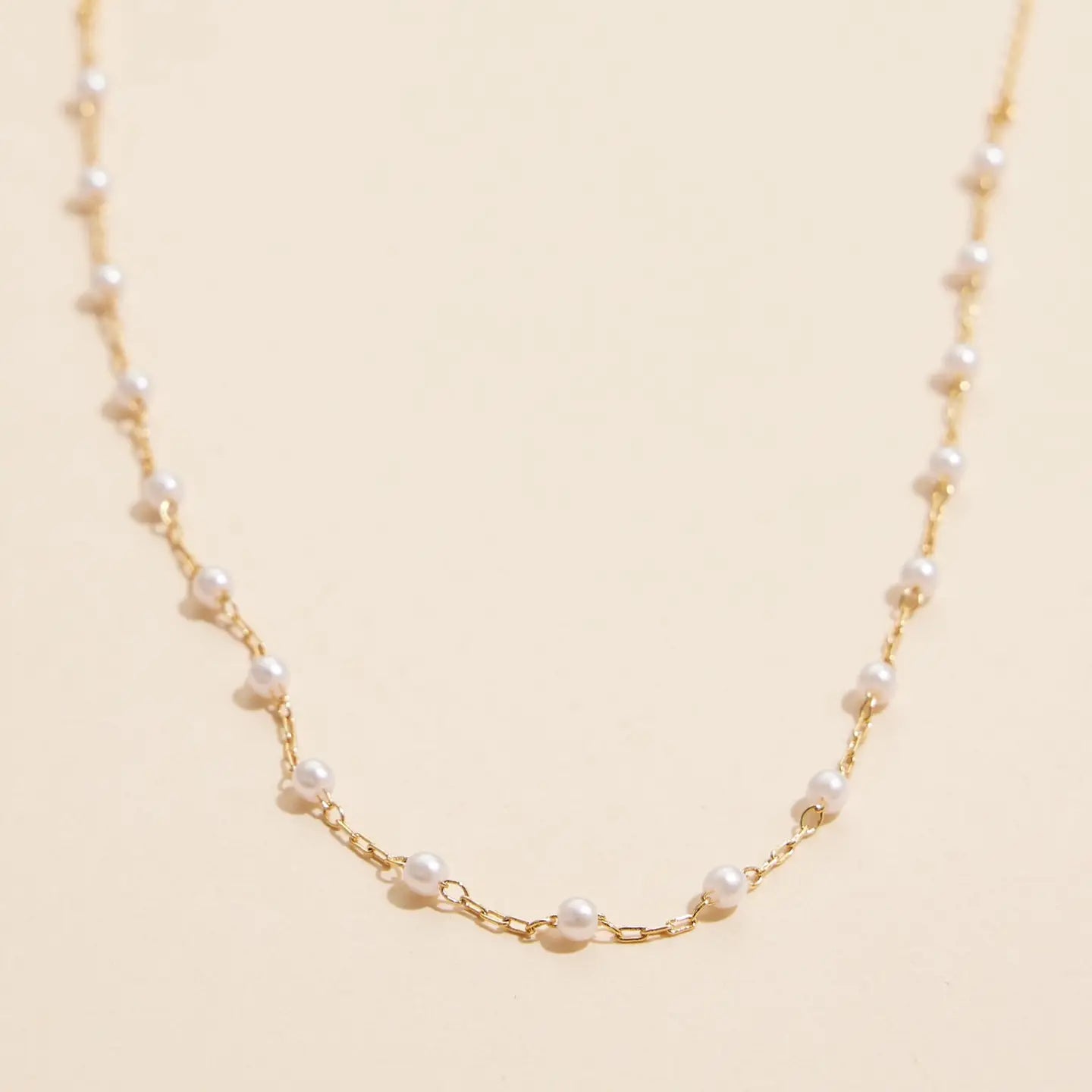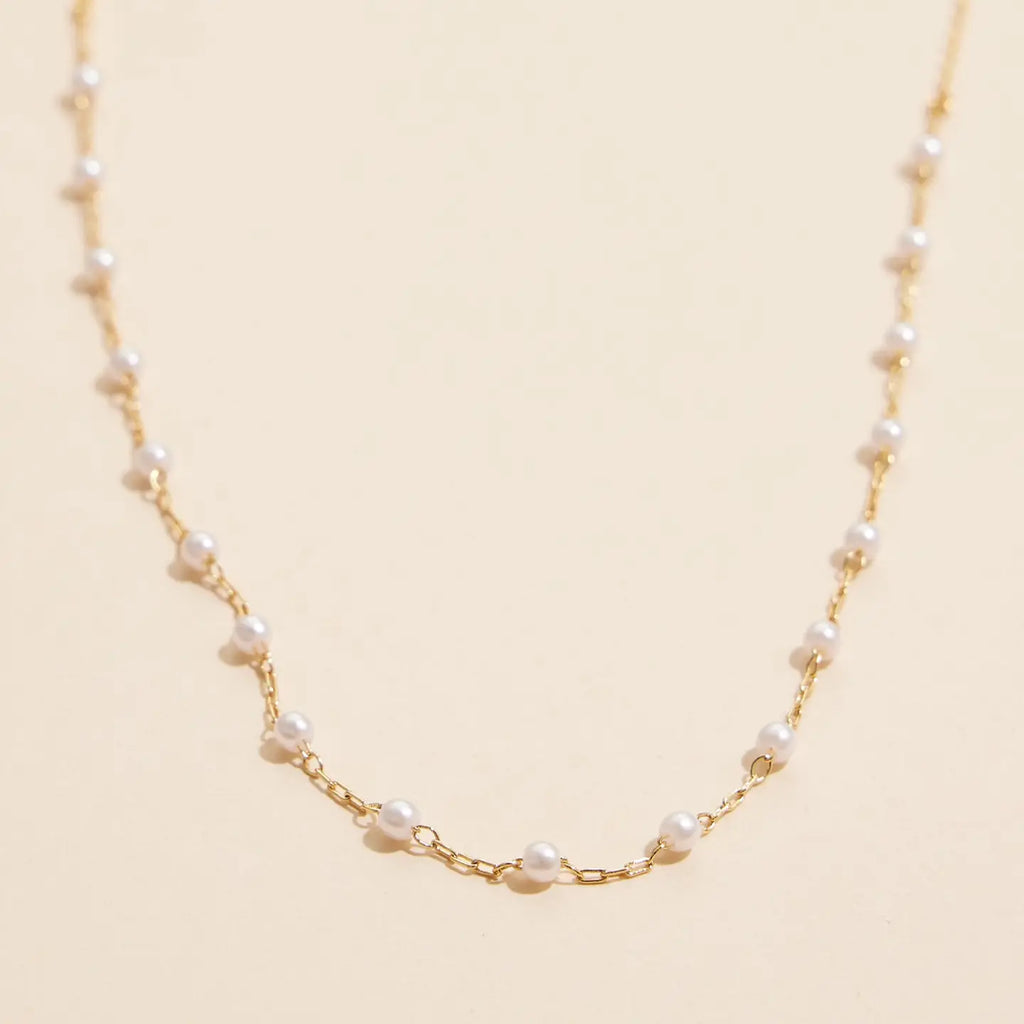 Elevate your elegance with this timeless gold pearl chain necklace. Featuring delicate pearls linked on a durable 18K gold-dipped chain, this piece blends classic charm with modern versatility. Perfect for layering or wearing solo, the minimalist design makes it suitable for both casual and formal occasions. The pearls add a touch of sophistication, while the gold or sterling silver dipped finish ensures lasting shine. Whether you're looking for a special gift or a staple for your jewelry collection, this necklace is an essential addition to any wardrobe. Available in both gold and sterling silver finishes.