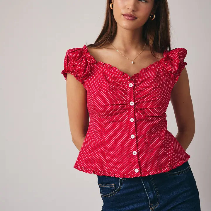 Cap Sleeve Button Down Polka Dot Top - Red / L is backordered and will ship as soon as it is back in stock.