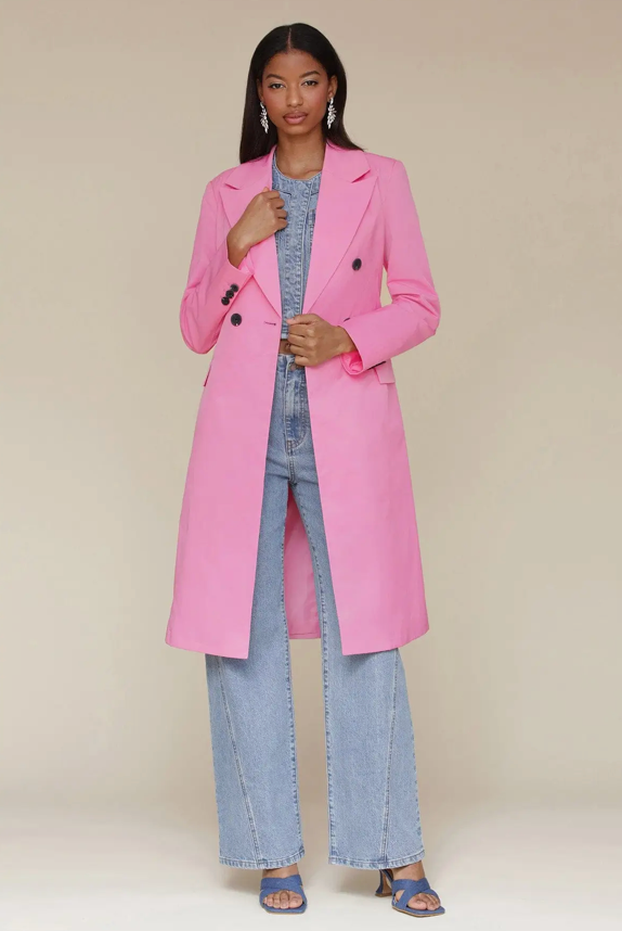 Our best-selling cotton-nylon trench is back for spring! Featuring shoulder pads, flap pockets, a detachable tie belt, and a mid-weight stretchy fabrication, this will add relaxed polish to all of your springtime looks.