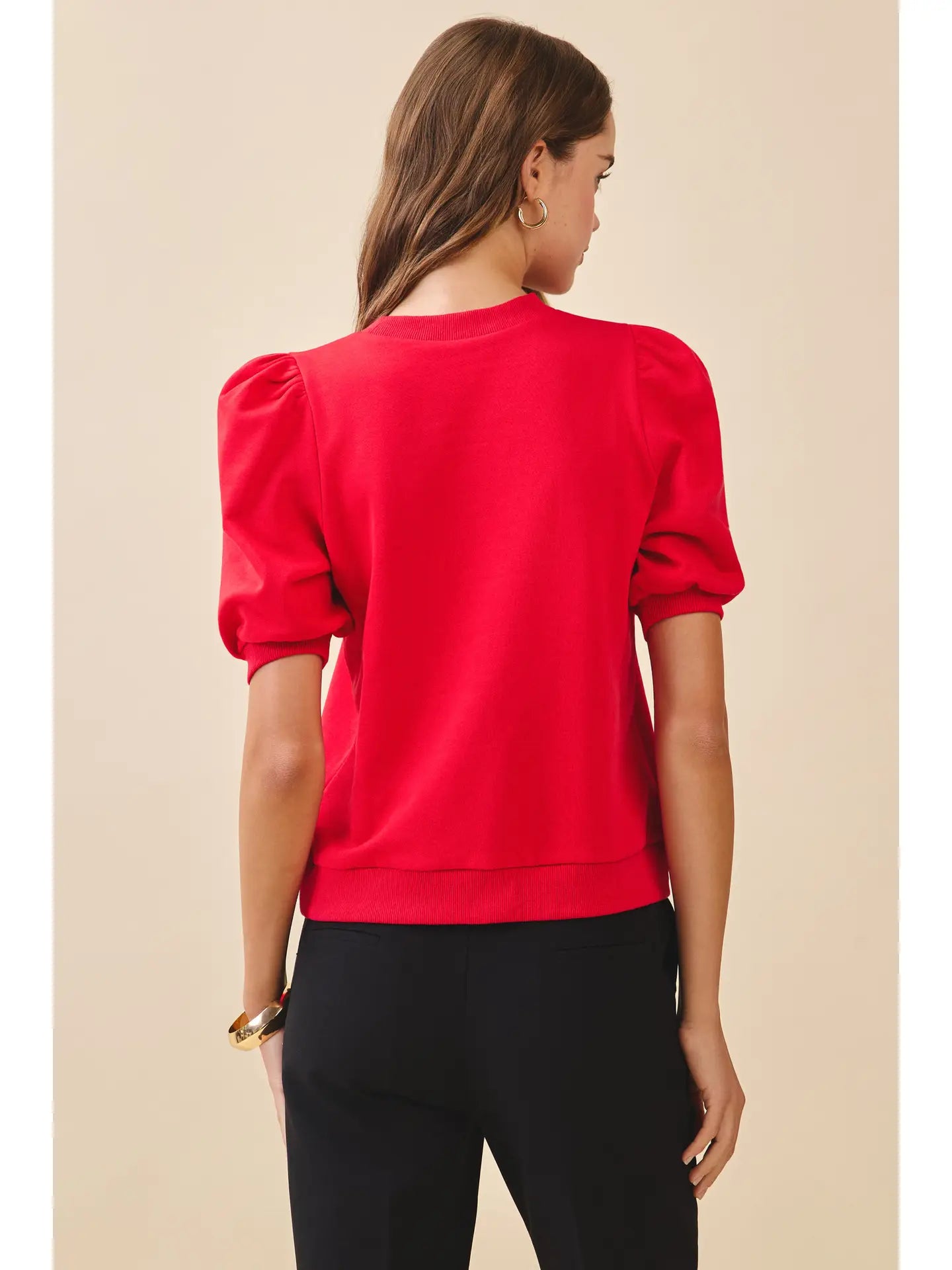 A knit top featuring a crew neckline, short puff sleeves with gathered shoulders, and ribbed cuffs and hem for a polished fit.