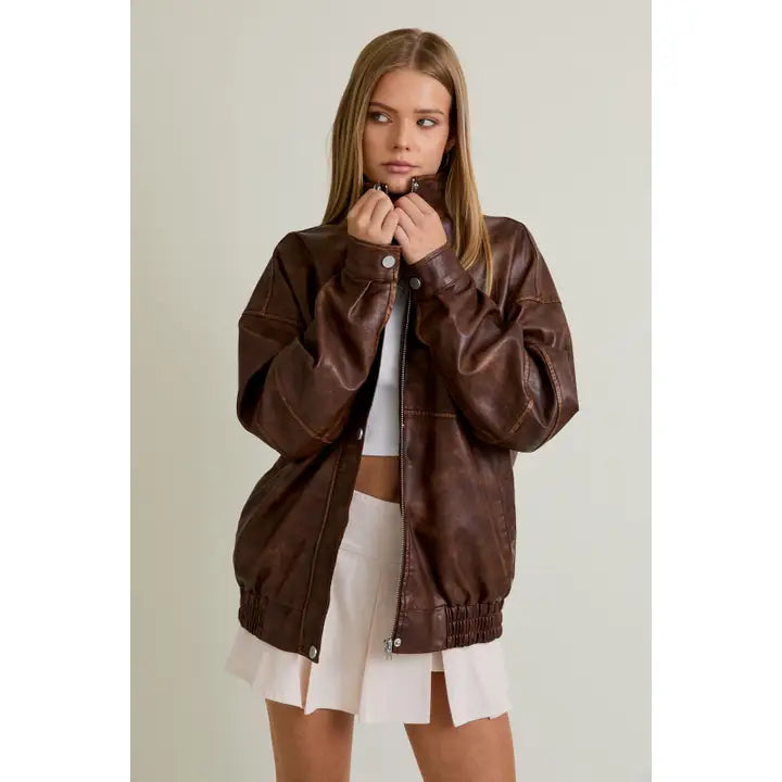 Faux Leather Oversized Bomber Jacket - Dark Brown / L is backordered and will ship as soon as it is back in stock.