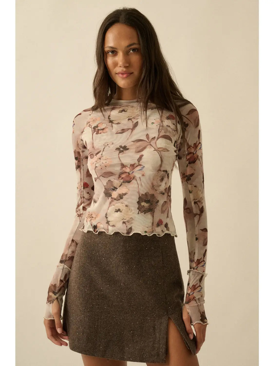 Floral Mesh Raglan-Sleeve Mock-Neck Thumbhole Top