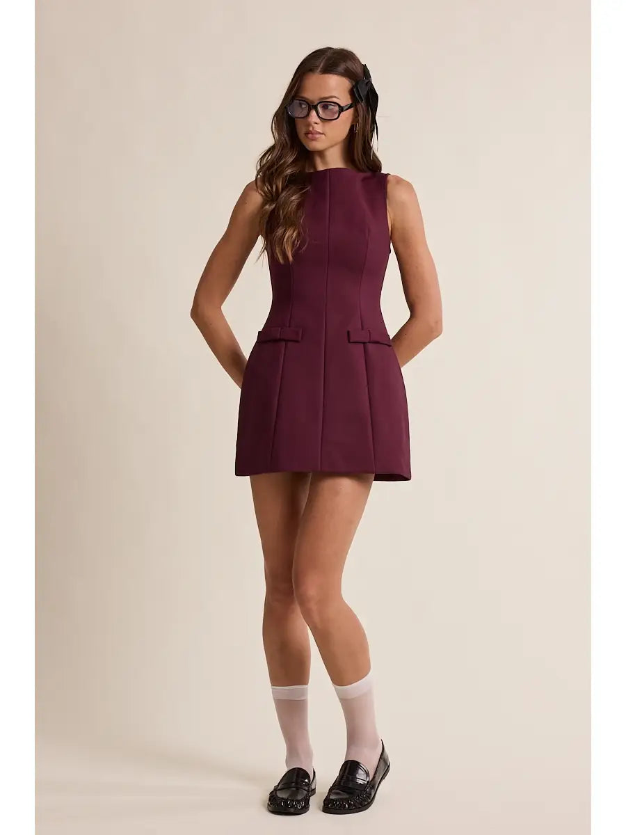 Dark Solid Color Boat Neck Sleeveless Body-Conscious Fit Back Zipper Down Ribbon Point Holiday Mini Dress SELF:95%POLY/5%SPAN LINING:100%POLY * Model Info: Height 5'9.5" Bust 33" Waist 24" Hip 34"