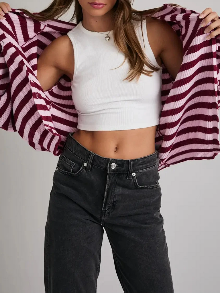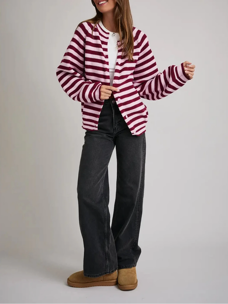 Raglan Long Sleeve Crew Neck Striped Cardigan