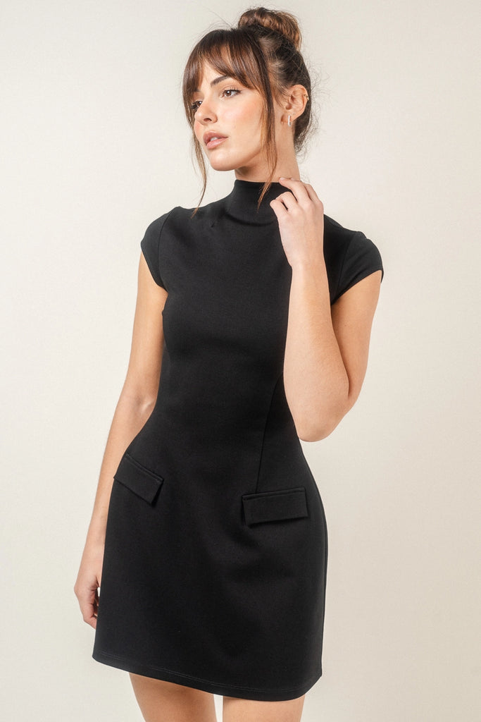 This dress is perfect for a wide range of occasions, from cocktail parties to weddings to a night out with friends. Whether you're looking for an elegant dress or a bodycon dress, this dress is the perfect choice. It's versatile, stylish, and comfortable, making it an excellent addition to any wardrobe. FAUX FLAP POCKET MOCK NECK SHORT SLEEVE DROPPED WAIST MINI LENGTH MINI DRESS SUBTLE RETRO VINTAGE W/ MODERN FLARE