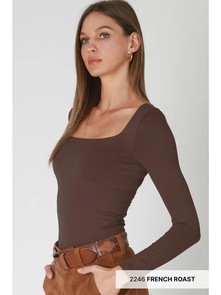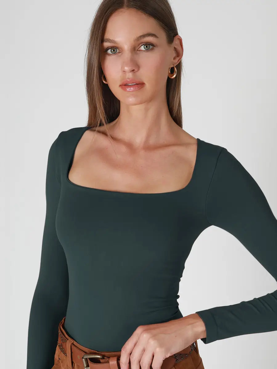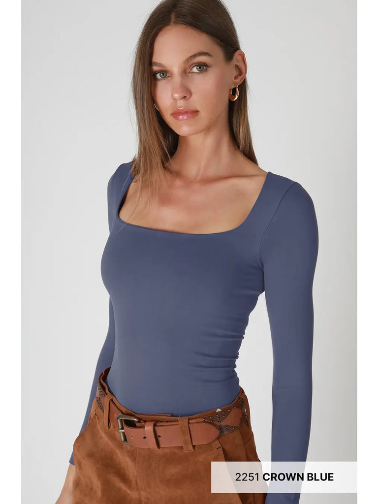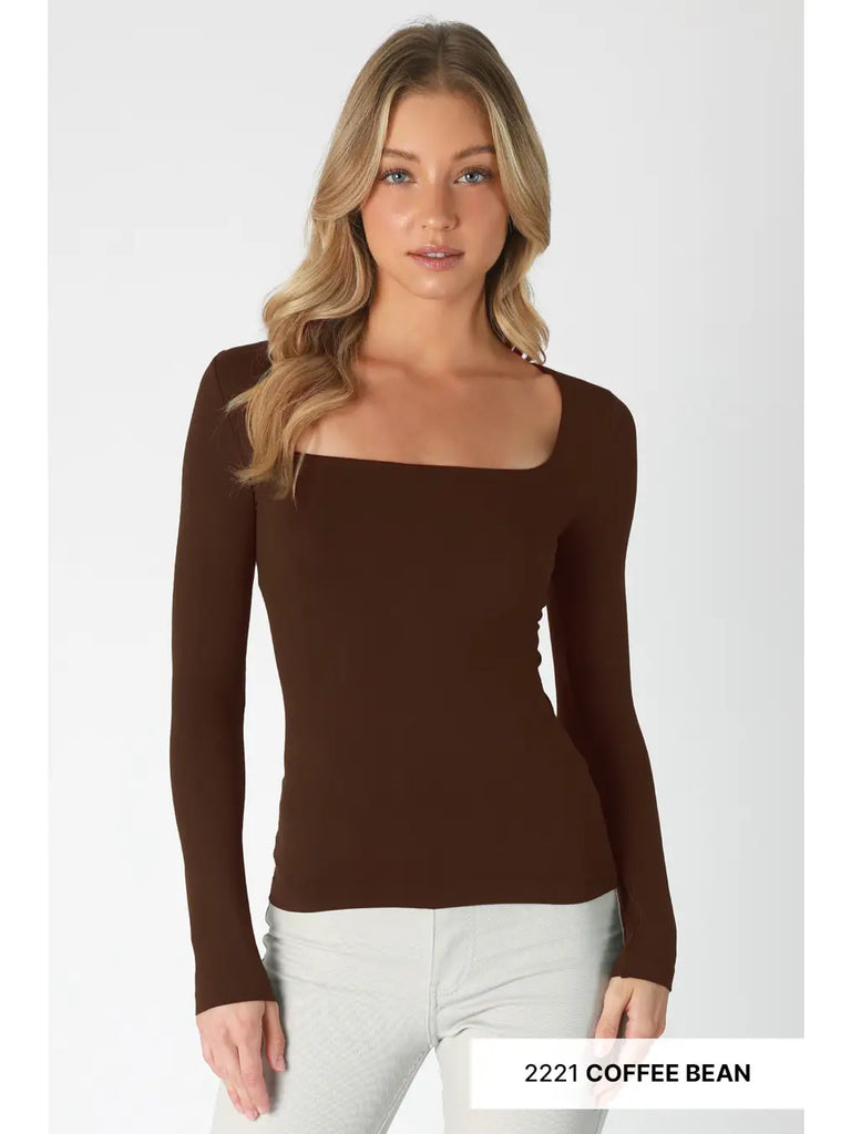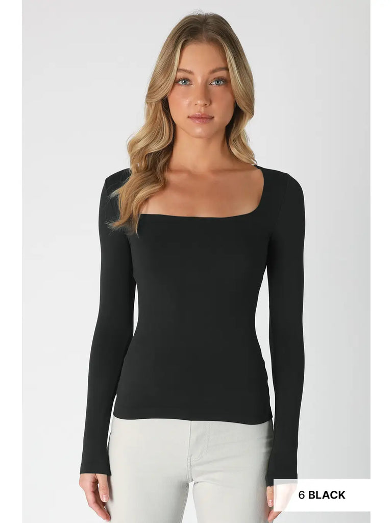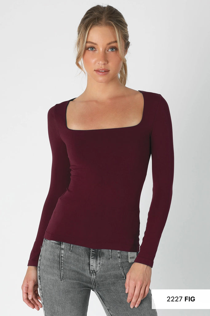 A seamless solid Square Neck long sleeve top. Fabric: 92% Nylon / 8% Spandex Made in USA