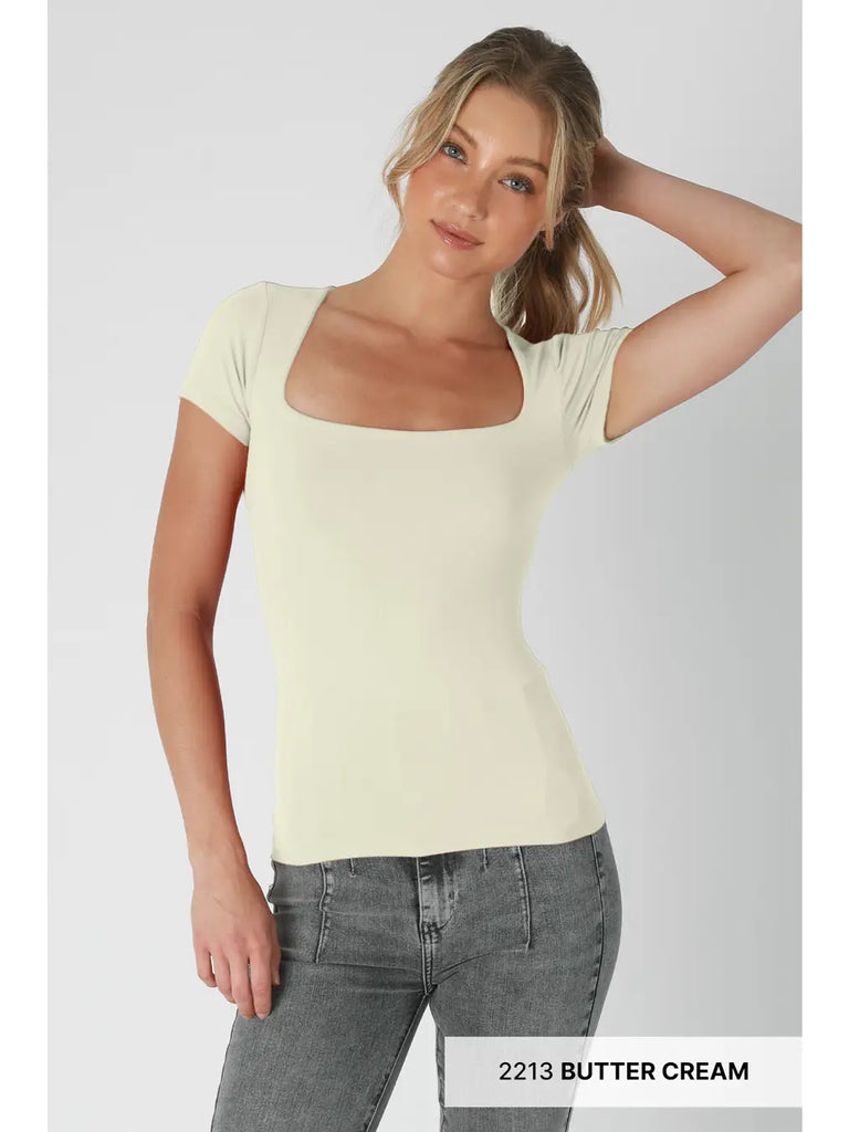 A seamless solid Square Neck cap sleeve top. Made in USA Fabric: 92% Nylon / 8% Spandex One size