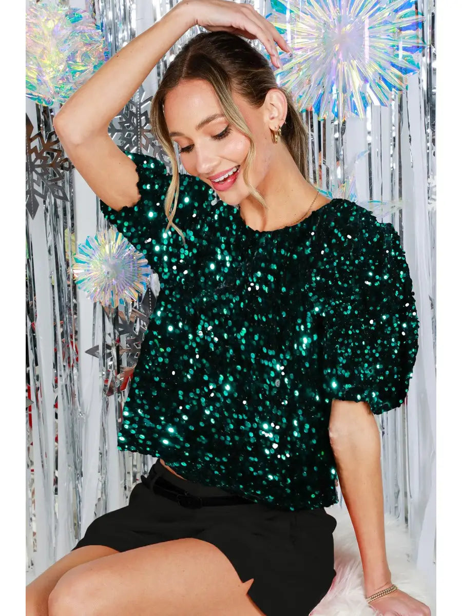 Velvet Sequin Round Neck Puff Sleeve Blouse