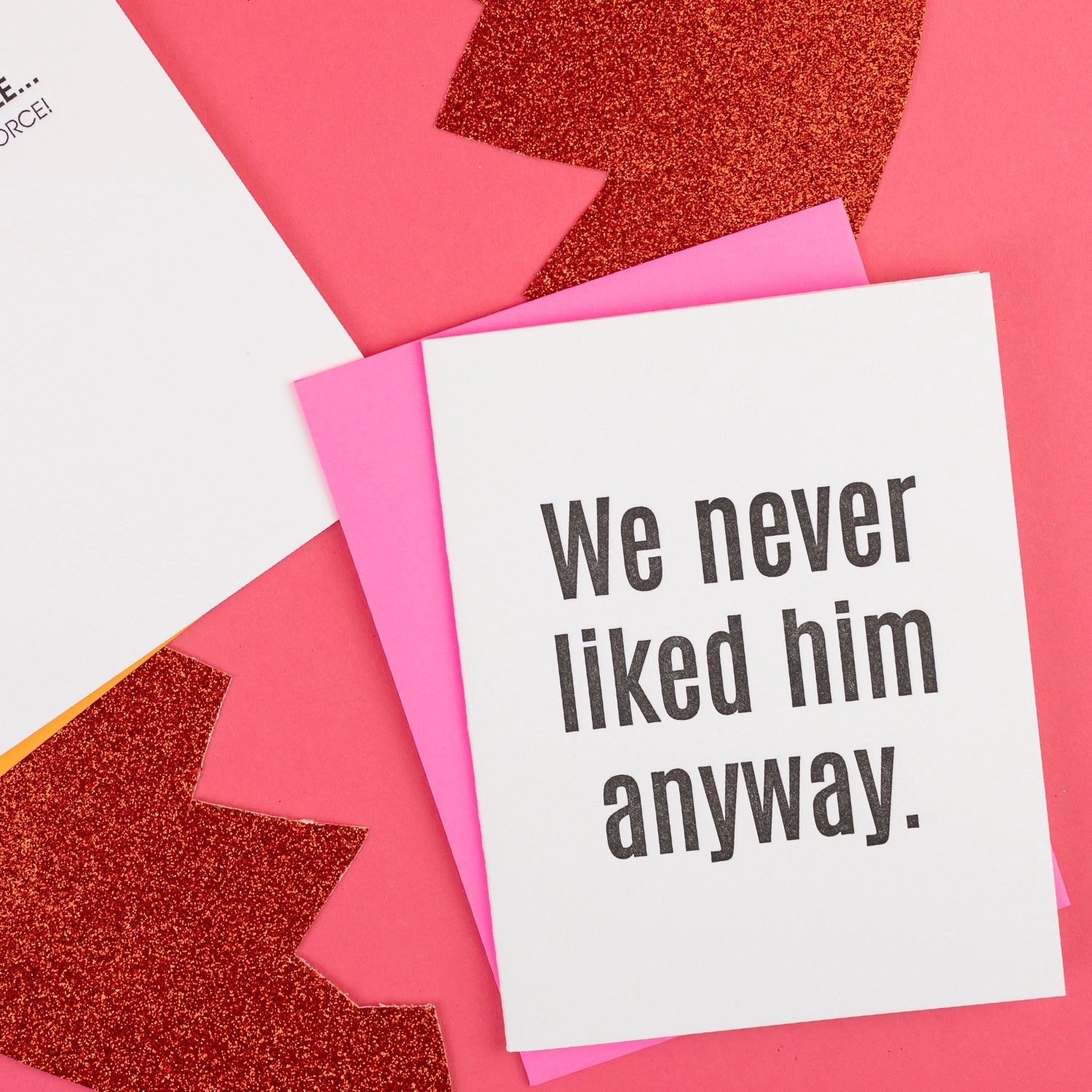 Details: • Letterpress printed on a vintage printing press • Paper: Bright White, Tree-Free 100% Cotton Paper • Ink: Black • Envelope: Neon Pink • Size: 5.5” x 4.25” • Folded card, blank inside • Sealed in a cello sleeve • Made in California Best For: • Breakups • Divorces • Friendship encouragement • Funny support